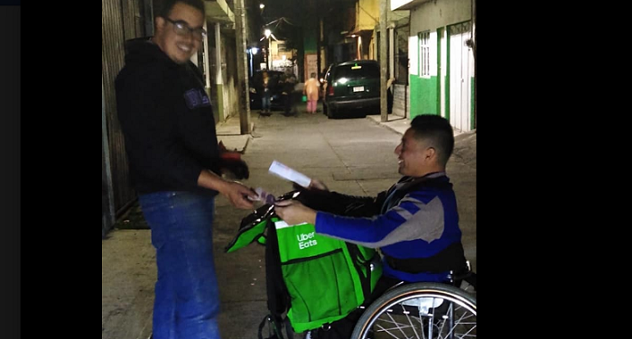 Michoacán.- A través de redes sociales se viralizaron unas fotografías de un joven que trabaja como repartidor de comida en Uber Eats, con la gran peculiaridad que realiza sus entregas desde su silla de ruedas.