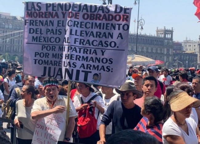 Rafael Acosta Ángeles “Juanito”, se enfrenta verbalmente contra un grupo de asistentes a Palacio Nacional. Con una pancarta acusa al presidente andres Manuel López Obrador de robar la educación de los niños del país, dejar a 500 mil trabajadores despedidos y frenar el crecimiento de México.