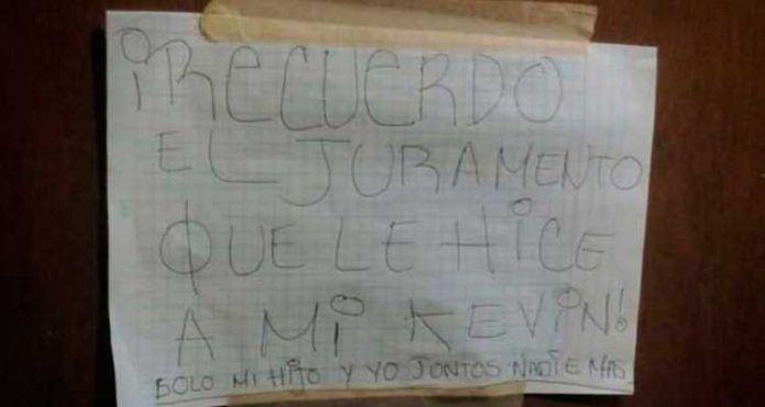 Indicó que horas después, al regresar a la casa, subió a la planta alta y encontró pegado en la puerta de una de las recamaras, una hoja de papel con un mensaje que textualmente decía: “¡Recuerdo el juramento que le hice a mi Kevin sólo mi hijo y yo juntos nadie más!”.