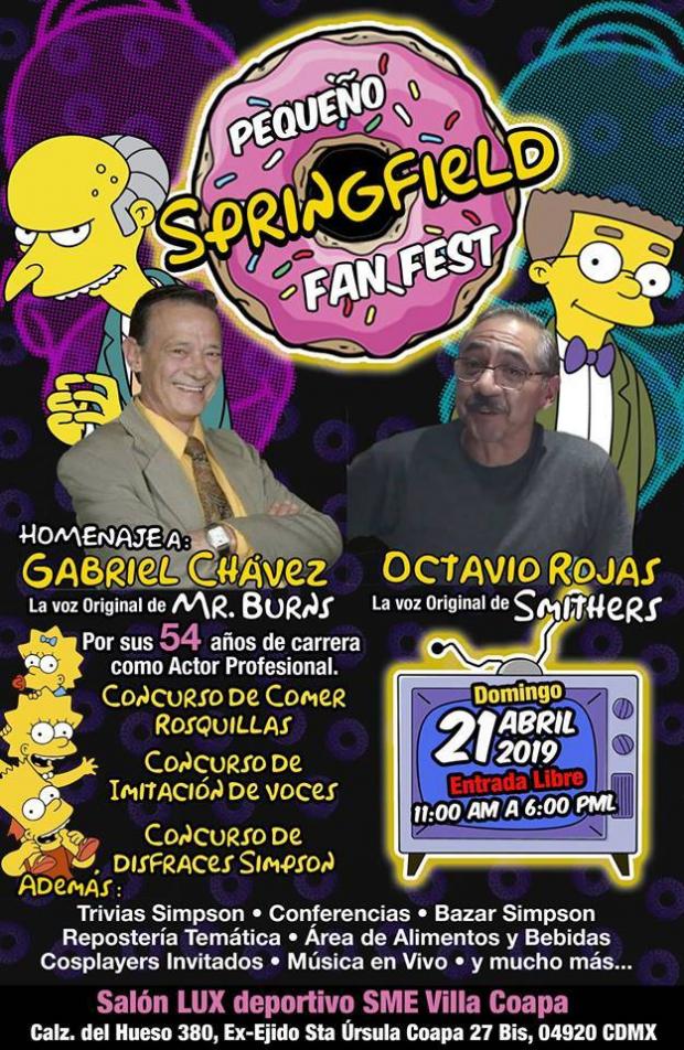 Llevará por nombre “Pequeño Springfield Fan Fest” y se llevará a cabo el próximo 21 de abril en la Ciudad de México, en el Salón LUX del Deportivo SME Villa Coapa; teniendo como invitados especiales al Señor Burns y Smithers, es decir, a Gabriel Chávez y Octavio Rojas, quienes hicieran las voces en español en las primeras temporadas del show. Ellos estarán firmando autógrafos y conviviendo con los fans durante todo el evento, que iniciará a las 11 de la mañana y terminará a las 6 de la tarde.