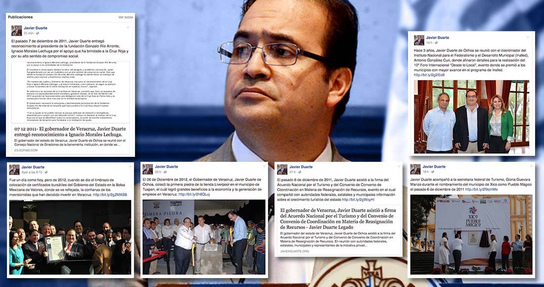 La cuenta Javier Duarte de Ochoa en Facebook lleva 24 horas activa. Publica sus “logros” durante su paso como Gobernador de Veracruz. En el primer post, ayer, hizo memoria sobre noticias que se dieron a conocer en 2012, cuando era considerado por el Presidente Enrique Peña Nieto como “ejemplo del nuevo PRI”. Esta mañana siguió publicando a pesar de ser buscado por la PGR por las acusaciones de enriquecimiento ilícito y desvío de recursos públicos. Este miércoles destacó: “El pasado 7 de diciembre de 2011, Javier Duarte entregó reconocimiento al presidente de la fundación Gonzalo Río Arronte, Ignacio Morales Lechuga por el apoyo que ha brindado a la Cruz Roja y por su alto sentido de compromiso social”. Se trata de la cuenta que Duarte usó durante seis años. ¿Es él, desde la clandestinidad? ¿Quién alimenta su cuenta?