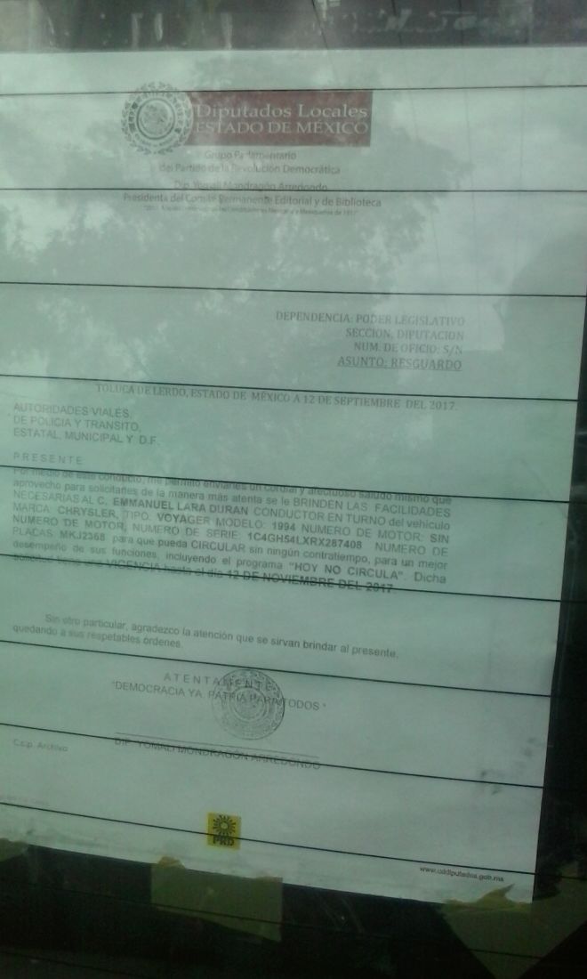 El documento fechado apenas el 12 de septiembre de 2017 y dirigido a las autoridades de vialidad del estado de México municipios y “DF”, se les pide dar facilidades al conductor para que se le permita circular “sin ningún contratiempo para un mejor desempeño de sus funciones, incluyendo el programa “HOY NO CIRCULA”.