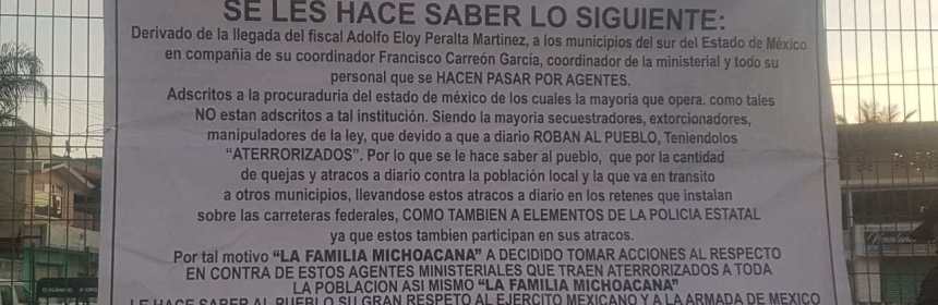 Sicarios de la Familia Michoacana (FM) fueron los que “ajusticiaron” a dos civiles que fungían como “izquierdos” del fiscal de Tejupilco, Adolfo Eloy Peralta Martínez, porque se dedicaban a “robarle al pueblo”, así como dedicarse a la extorsión y el secuestro.