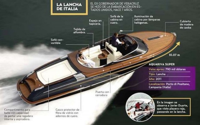 Según una nota de El Heraldo de México, la Procuraduría General de la República, en voz del subprocurador Enrique Hernández Azuara, no sabe en dónde se encuentra el vehículo marino modelo 2011, valuado en 790 mil dólares, que Duarte mandó a comprar en Estados Unidos para tener una embarcación “digna de su investidura”.