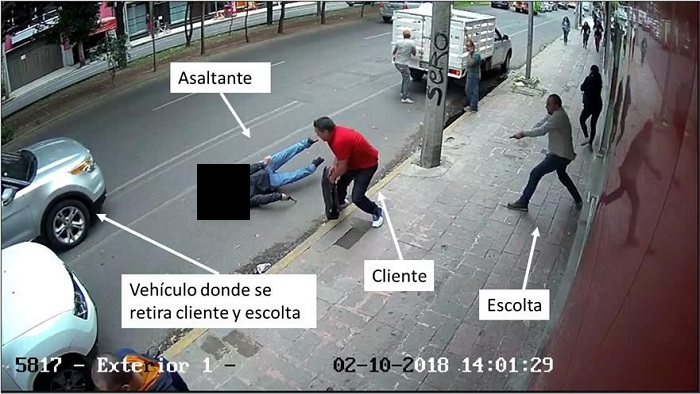 La Procuraduría General de Justicia de la Ciudad de México (PGJCDMX) , a través de varias cámaras de vigilancia y del seguimiento que se le hizo a un vehículo, logró la identificación del empresario y el guardaespaldas que este martes asesinó a un delincuente que intentó robar más de 100 mil pesos a su patrón, que recién había retirado de una sucursal de Santander en Polanco.