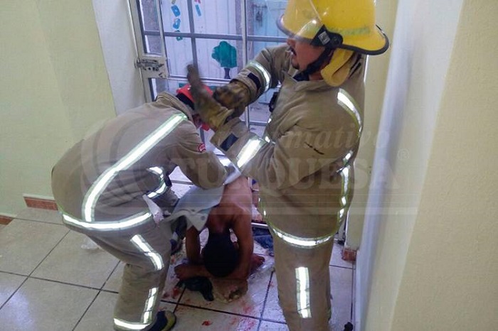Después de varias horas de rescate, el hombre fue liberado del marco de vidrio y entregado a la policía municipal.