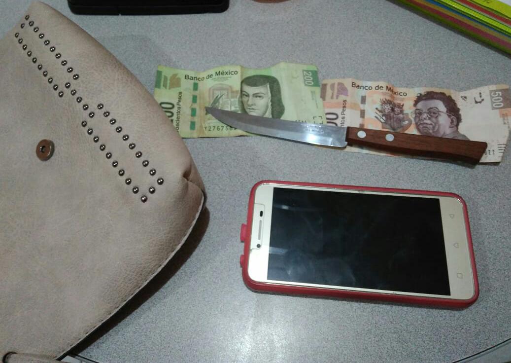 Al llevar a cabo la inspección de rutina, los Policías encuentran entre las pertenencias de esta persona un cuchillo de sierra de la maevae “Tramontina” de 25 cm de largo con mango de madera de color café, un teléfono celular tipo Lenovo con carcasa rosa con blanco, una bolsa de vinil color beige y 700 pesos en efectivo de los cuales no pudo aclarar su procedencia.