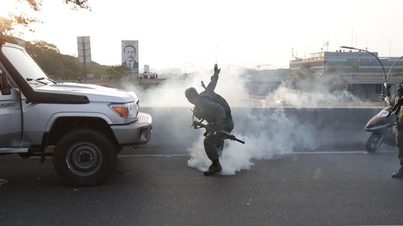Las fuerzas de seguridad de Venezuela que son leales al Gobierno de Nicolás Maduro han lanzado este martes bombas lacrimógenas contra el líder opositor Juan Guaidó, que está acompañado por militares en levantamiento contra el Gobierno de Nicolás Maduro.