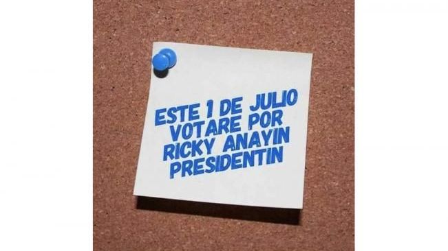 Mediante una imagen con la leyenda “Este 1 de julio, votaré por Ricky Anayin Presidentin”, es como los panistas en sus cuentas de redes sociales convocan a votar por el aspirante de la coalición Por México Al Frente.