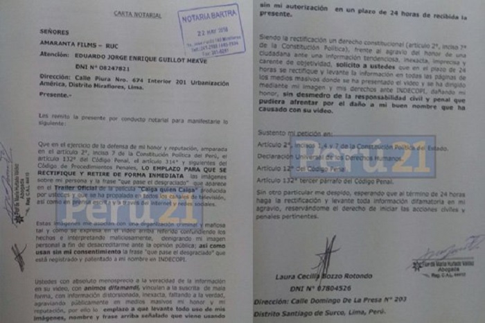 “Mandamos ayer una carta notarial y tenían 24 horas para sacar toda imagen que tenga que ver conmigo en la película y la frase: “Que pase el desgraciado” de la que soy propietaria. Nadie puede usar la frase…”, dijo al periódico Debate.
