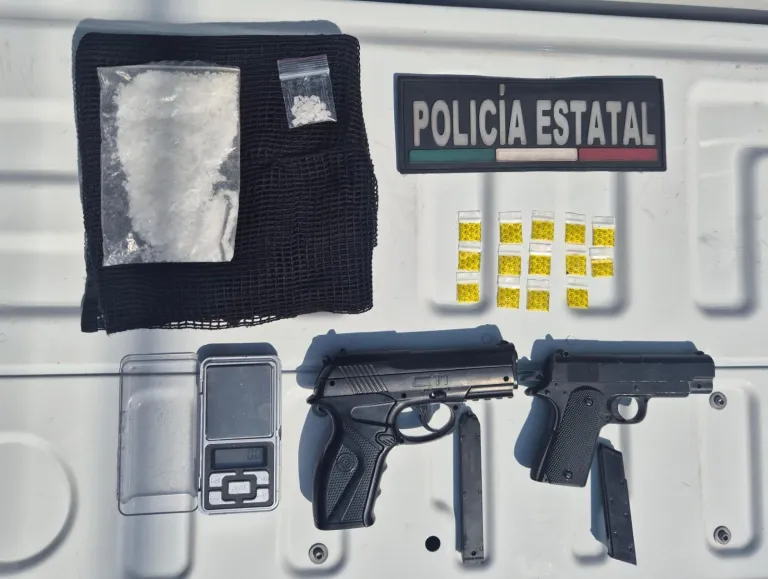 * Se aseguraron 15 envoltorios plásticos con probable cocaína, dos réplicas de arma y una báscula gramera.
