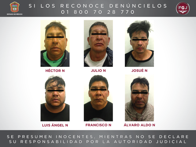 En conferencia de prensa, Alejandro Gómez Sánchez, Fiscal General de Justicia del Estado de México, informó que se trata de Héctor “N”, Julio “N”, Josué “N”, Luis Ángel “N”, Francisco “N” y Álvaro Aldo “N”, quienes presumiblemente participaron en el secuestro de un joven, en el municipio de Chimalhuacán
