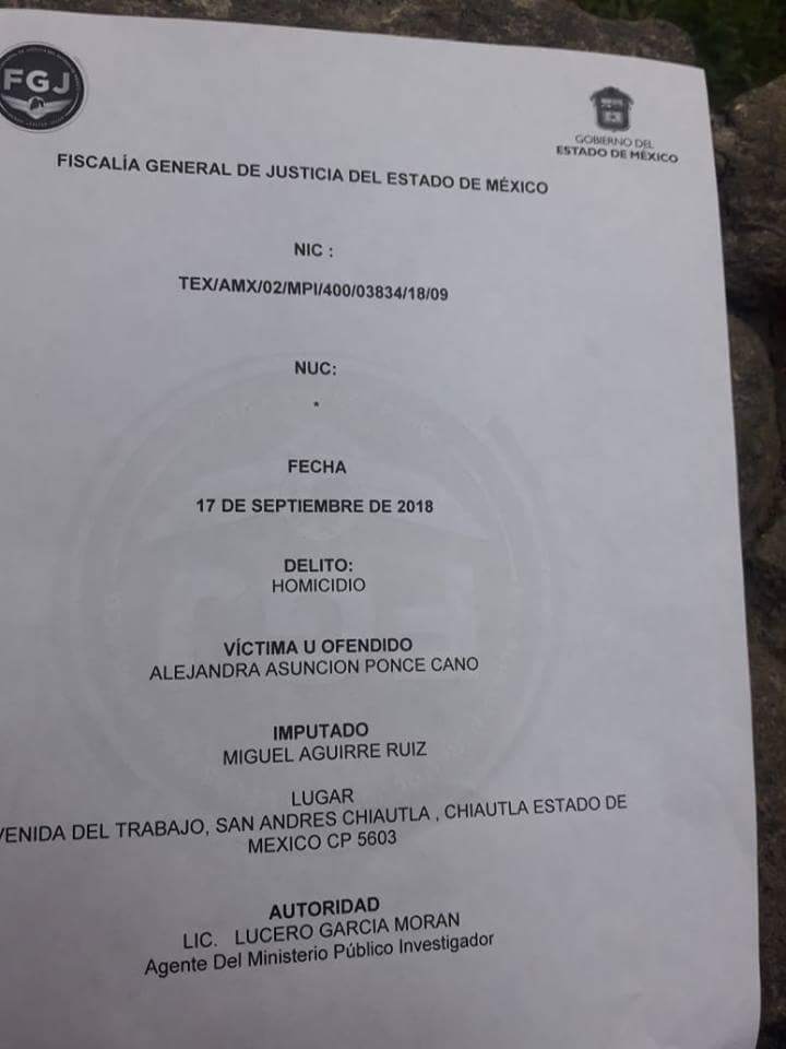 Los familiares de la fallecida interpusieron una denuncia ante la Fiscalía General de Justicia del Estado de México por el delito de homicidio en contra del Doctor Miguel Aguirre Ruiz, donde los hechos quedaron asentados en la carpeta TEX/AMX/02/MPI/400/03834/18/09