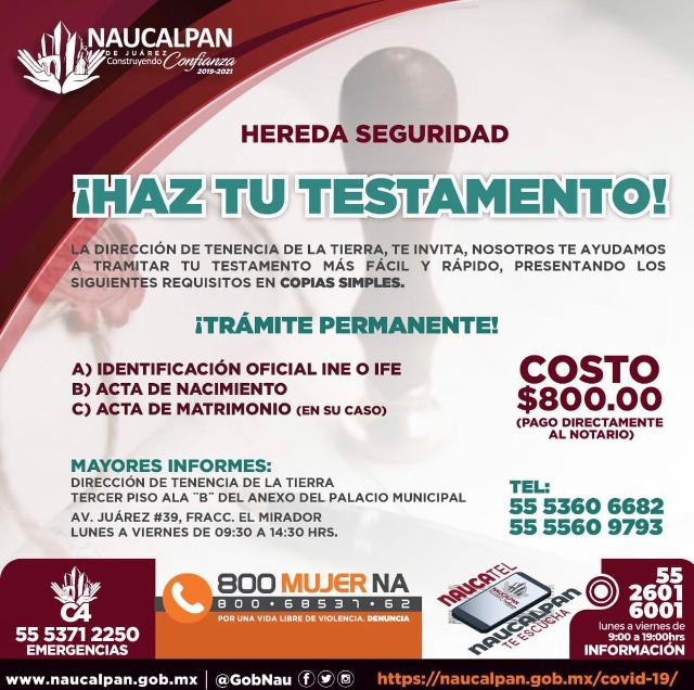 El Gobierno de Naucalpan invita a la ciudadanía a realizar su testamento con precios preferenciales, como parte de la campaña nacional Septiembre, Mes del Testamento 2020.