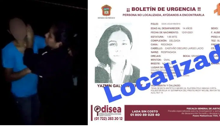 La Fiscalía General de Justicia del Estado de México (FGJEM) informa que fue localizada en el estado de Oaxaca Yazmín Galván Pérez, de 19 años, por quien esta Institución emitió un Boletín de Urgencia para su localización desde el día 11 de mayo del año 2015.