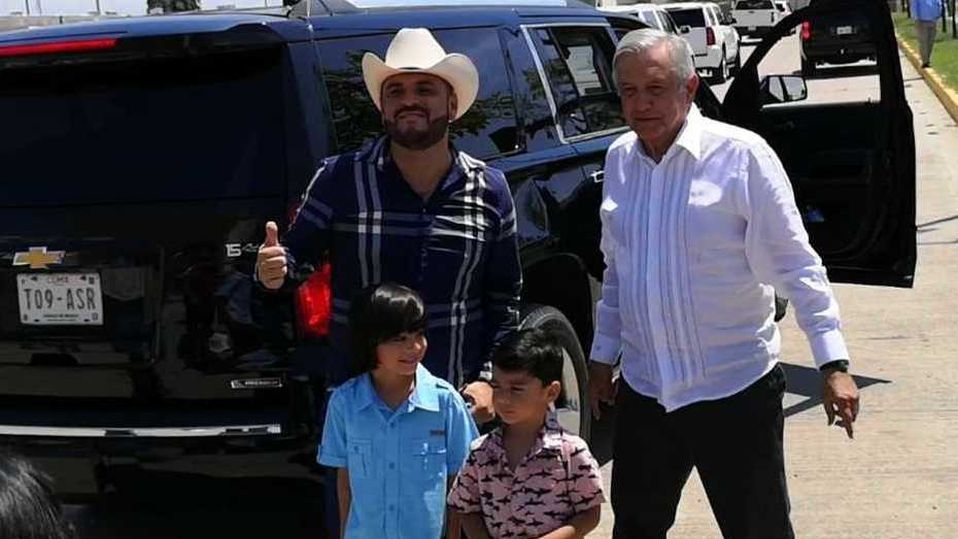 Al retirarse en su camioneta, tras la supervisión de los avances del dren de Bacurimí, el titular del Ejecutivo federal fue abordado por la familia del cantante, por lo que accedió a bajarse y con sana distancia se tomó fotografías con ellos.