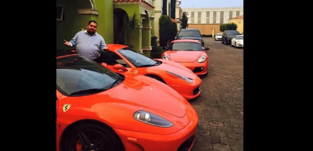 En la última fotografía se le puede ver junto a tres automóviles Ferrari, con un valor aproximado de 3 millones de pesos, además es dueño de un auto Rolls Royce, en el que viajaba el día que sus escoltas agredieron a un Policía Federal en Toluca, lo que le valió el apodo de #LordRollsRoyce.
