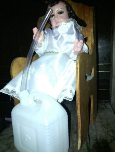 Así surgió el ‘Santo Niño Huachicol’, un niño similar al de Atocha pero en lugar de traer báculo y flores porta un bidón de gasolina y una manguera, las herramientas básica para realizar el hurto de combustible.