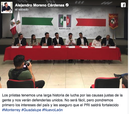 Los gobernadores de Oaxaca y Campeche, Alejandro Murat Hinojosa y Alejandro Moreno Cárdenas, estuvieron en la sede del PRI de Nuevo León para apoyar a Adrián de la Garza Santos, alcalde electo de Monterrey, y Cristina Díaz Salazar, quien obtuvo el triunfo en Guadalupe.