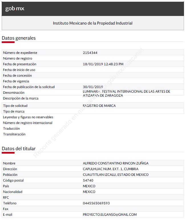 Es por eso que, aunque el registro con el folio número 2154344, fue correctamente tramitado, el nombre de “LUMINARIAS”o “LUMINARIA”, Festival internacional de las Artes de Atizapán de Zaragoza, podría usarse únicamente si se pagan los derechos, sin embargo, (según el gobierno) municipal de Atizapán de Zaragoza ante la petición constante de una fuerte suma de dinero por parte de un particular, decidió crear el Festival Internacional de Cultura 2019 no cediendo y le cambiaron el nombre.
