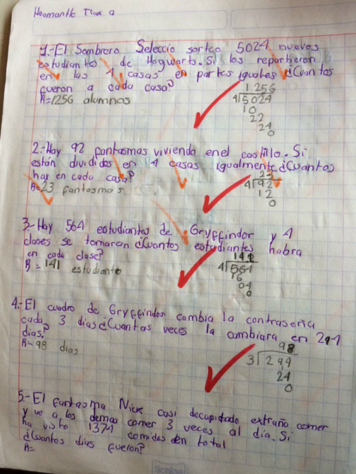 Con sencillos problemas como: “El sombrero seleccionador sorteó 5 mil 024 nuevos estudiantes de Hogwarts. Si los repartieron entre las cuatro casas en partes iguales, ¿cuántos fueron a cada casa?”, “mil 256 alumnos”, responde otra niña, y al lado, hace una división para explicar cómo llegó a ese resultado.