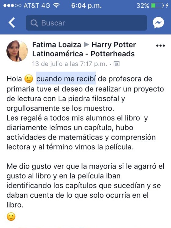 Fátima es fan de la saga de Harry Potter y quiso compartir sus gustos con sus alumnos, por lo que imprimió y fotocopió la primera novela de la autora británica Joanne Rowling, y se la repartió a sus 21 alumnos.