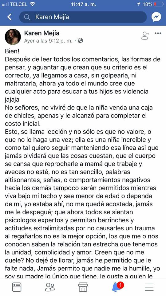 En su cuenta, la madre ya hizo la explicación del acto que efectuó y destacó que la lección es para que la niña valore el esfuerzo de sobresalir en la vida.