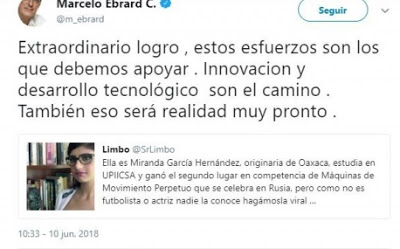 “Ella es Miranda García Hernández, originaria de Oaxaca, estudia en UPIICSA y ganó el segundo lugar en competencia de Máquinas de Movimiento Perpetuo que se celebra en Rusia, pero como no es futbolista o actriz nadie la conoce hagámosla viral”, dice la broma.