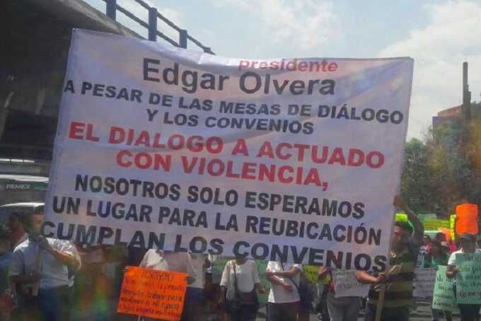 Con mantas en las que se lee “Presidente Edgar Olvera, a pesar de las mesas de diálogo y los convenios, el diálogo ha actuado con violencia, nosotros solo esperamos un lugar para la reubicación. ¡Cumplan los convenios!”, los inconformes avanzan sobre la vía Gustavo Baz, rumbo al palacio municipal.