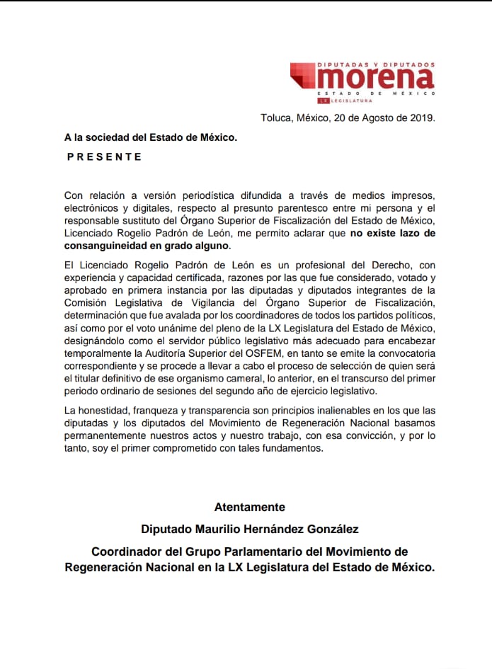 “Con relación a versión periodística difundida a través de medios impresos, electrónicos y digitales, respecto al presunto parentesco entre mi persona y el responsable sustituto del Órgano Superior de Fiscalización del Estado de México, Licenciado Rogelio Padrón de León, me permito aclarar que no existe lazo de consanguineidad en grado alguno”.