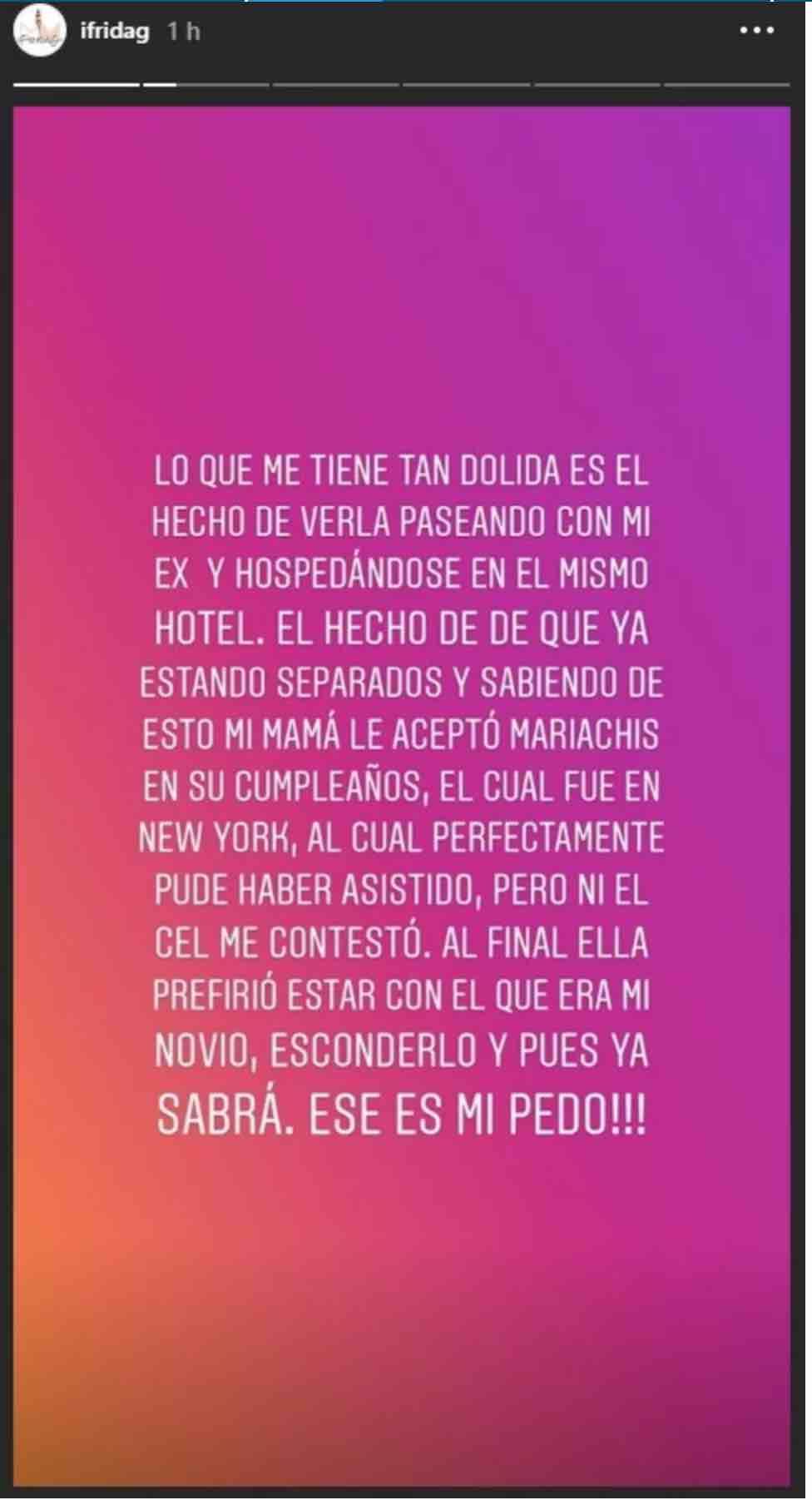 Sin embargo reiteró que la causa del distanciamiento entre ellas se debe a la cercanía de la Guzmán con su ex Christian Estrada, quien le llevó mariachis y Frida no estuvo invitada a la celebración. “Al final ella prefirió estar con el que era mi novio, esconderlo y pues ya sabrá, ese es mi pedo”, puntualizó.