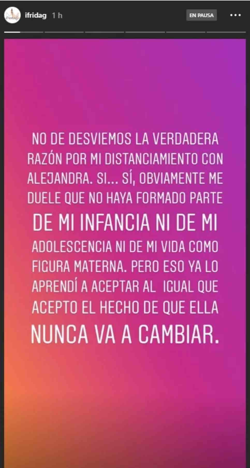 Frida detalló que sí le duele que su madre no haya formado parte de su infancia, ni de su adolescencia, ni de su vida, pero que aprendió a aceptar esto y a vivir con la realidad de no tener cerca a la Guzmán como una figura materna.