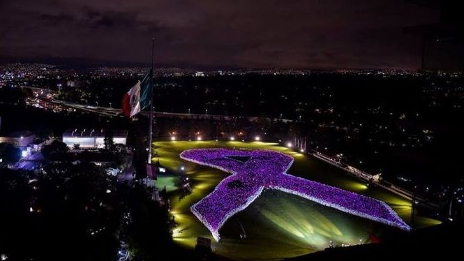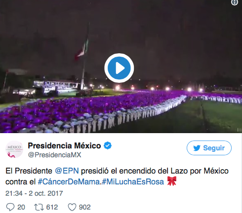La noche de este lunes, en Campo Marte, el presidente Enrique Peña Nieto encendió el “Lazo por México” —conformado por 12 mil personas—, como símbolo de solidaridad con los damnificados por los sismos del 7 y 19 de septiembre, así como para recordar el inicio de la lucha contra el cáncer de mama.
