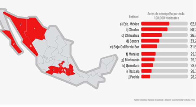 Durante 2015, en México se registraron 30 mil 97 actos de corrupción por cada 100 mil habitantes; los estados de México, Sinaloa y Chihuahua registraron las mayores tasas de incidencia de actos de corrupción, con 62 mil 160, 58 mil 232 y 36 mil 472 actos de corrupción respectivamente.