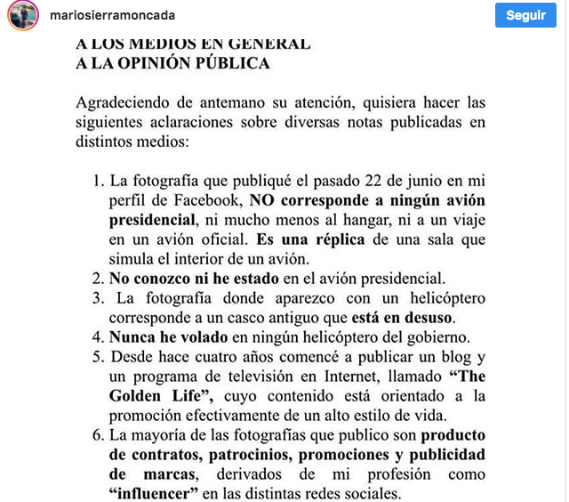 Por su parte, el hijo del general difundió un comunicado en su cuenta de Instagrama, en el que dice: “No conozco ni he estado en el avión presidencial”. Asimismo, explica que todo es parte de una estrategia en su blog, el cual fue cerrado tras la polémica publicación.