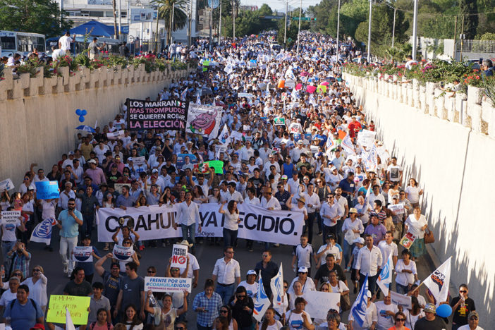 La movilización nombrada como el “Frente por un Coahuila Digno” fue convocada por Guillermo Anaya, candidato del Partido Acción Nacional (PAN), Armando Guadiana del Movimiento Regeneración Nacional (Morena) y el independiente Javier Guerrero, fue convocada el día de ayer para exigir un freno a las irregularidades en el pasado proceso electoral en el que el PRI sale favorecido colocándose como virtual ganador.