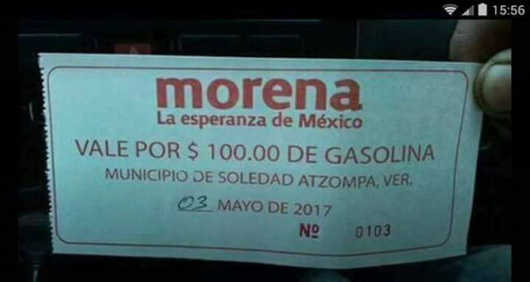 A través de redes sociales se difunde la imagen de un vale de gasolina expedido por Morena con valor de 100 pesos, válido en el municipio de Soledad de Atzompa, Veracruz, con fecha del 3 de mayo.