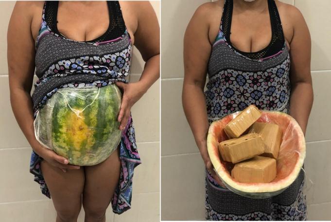 Los agentes de seguridad sospecharon de una mujer que decía estar embarazada, por lo que le realizaron una revisión, encontrando la corteza de una sandía rellena con aproximadamente 2 kilogramos de pasta bade de cocaína.