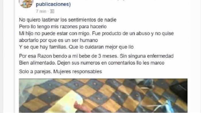 Ello señalaba el mensaje, que incluía la presunta imágen del menor. No obstante el post ya fue eliminado del grupo de Facebook, aunque de manera extraoficial trascendió que hubo ofertas de hasta 35 mil pesos por el menor.