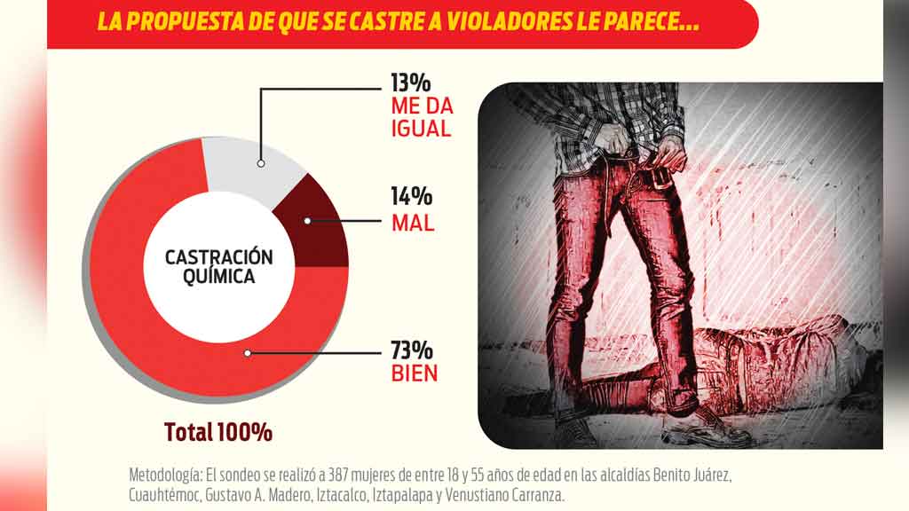 De las 387 mujeres encuestadas en seis alcaldías de la Ciudad de México, el 73 por ciento señaló que le parece bien que se castre a los violadores, mientras que el 14 por ciento indicó que la medida está mal porque atenta contra los derechos humanos o porque no es castigo suficiente para los criminales. No obstante, algo de llamar la atención es que a un 13 por ciento de las encuestadas les “da igual”.