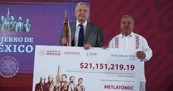 «Y se le entregan, creo que de una subasta de joyas, 40 millones de pesos a dos municipios pobres de La Montaña de Guerrero y yo hasta les entrego simbólicamente un cheque de papel. Pasan dos meses sin poder cobrar el cheque.», dijo el mandatario.