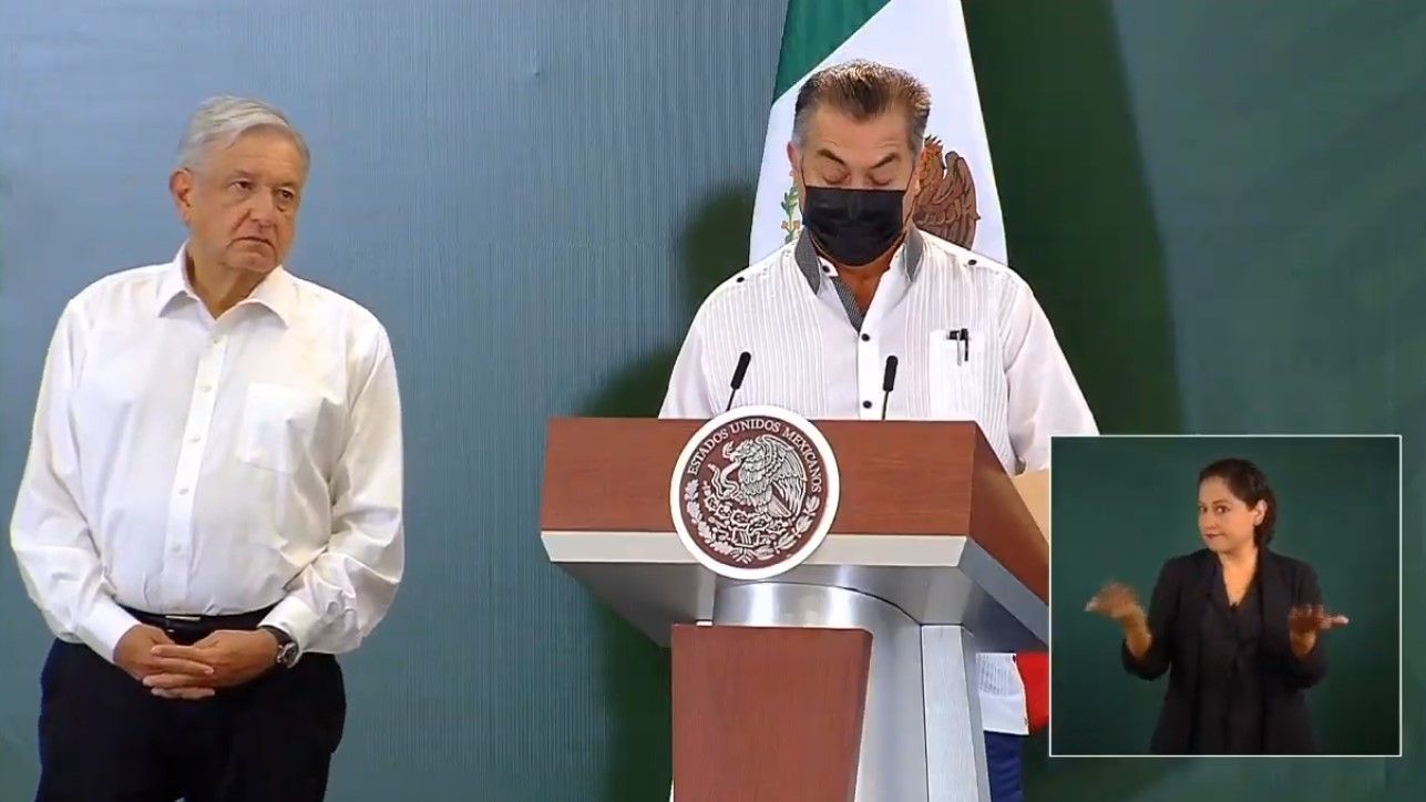 A pesar de las advertencias de Manuel de la O Cavazos, secretario estatal de Salud de Nuevo León, quien señaló que si no se cumplían las medidas de seguridad en salud sancionaría la conferencia matutina, esta mañana el presidente Andrés Manuel López Obrador no porta cubrebocas, así como la mayoría de los integrantes de su gabinete que lo acompañan y solo el gobernador Jaime Rodríguez Calderón, el secretario de Seguridad y Protección Ciudadana (SSPC), Alfonso Durazo Montaño, y la titular de Gobernación, Olga Sánchez Cordero, lo portan.