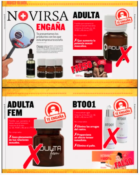 Por ejemplo, Adulta y Adulta Fem que supuestamente aumentan la potencia sexual masculina y femenina es falso. Esa misma marca tiene otro producto que se llama BT001 el cual dice eliminar las arrugas del rostro y proporcionar un efecto tensor inmediato, pero en realidad los tres productos engañan al consumidor.