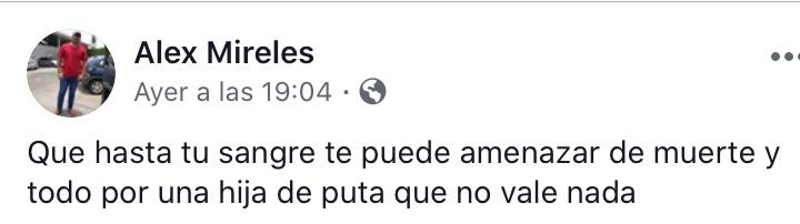 “Que hasta tu sangre te pueda amenazar de muerte y todo por una hija de puta que no vale nada”, publicó en su página de Facebook Alex Mireles, hijo del subdelegado del Instituto de Seguridad y Servicios Sociales de los Trabajadores del Estado (ISSSTE).