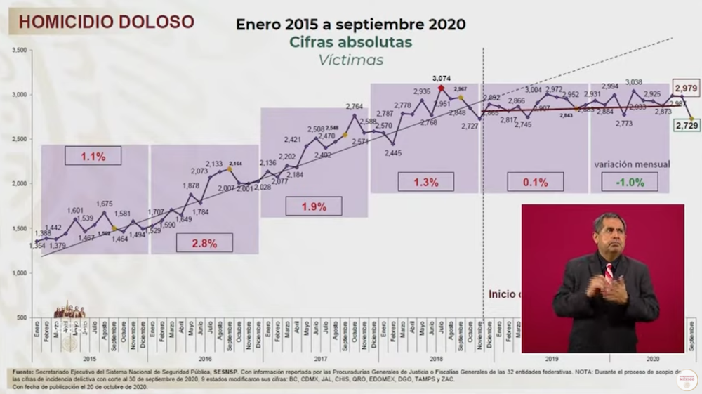 Durante su exposición sobre la cifra de homicidios dolosos, el titular de la Secretaría de Seguridad y Protección Ciudadana aseguró que estos han disminuido en septiembre, lo que representa la segunda baja consecutiva.