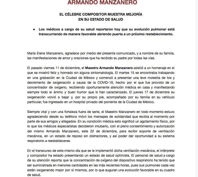 “Siempre vital y con una fortaleza fuera de serie, el maestro Armando Manzanero en todo momento estuvo agradecido desde su teléfono móvil los mensajes de solidaridad que recibía al momento por parte de sus amigos y allegados”, se lee en el documento.