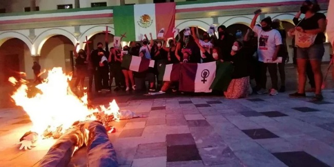 Colectivas de mujeres en el zócalo de Veracruz quemaron un muñeco de tela con la imagen del presidente Andrés Manuel López Obrador, luego de dar la “anti grita” por las fiestas patrias; en reclamo por la violencia de género y los feminicidios en la entidad y el resto de la república.