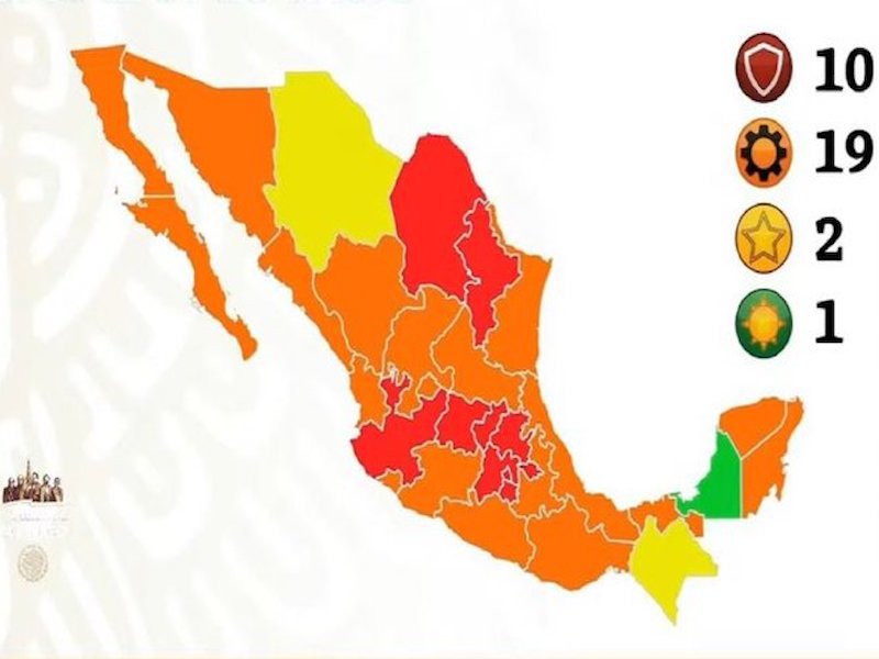 Mientras que en “naranja” (alto riesgo) estarán 19: Baja California, Baja California Sur, Sonora, Sinaloa, Durango, Zacatecas, San Luis Potosí, Nayarit, Tamaulipas, Aguascalientes, Colima, Michoacán, Guerrero, Oaxaca, Puebla, Veracruz, Tabasco, Quintana Roo y Yucatán.