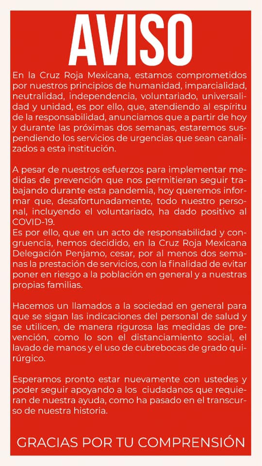 La Cruz Roja Mexicana de Pénjamo Guanajuato envió en sus redes sociales un mensaje de alerta para la población y para el gobierno ya que pese a las acciones realizadas todo su personal sin excepción alguna ha dado positivo al coronavirus.