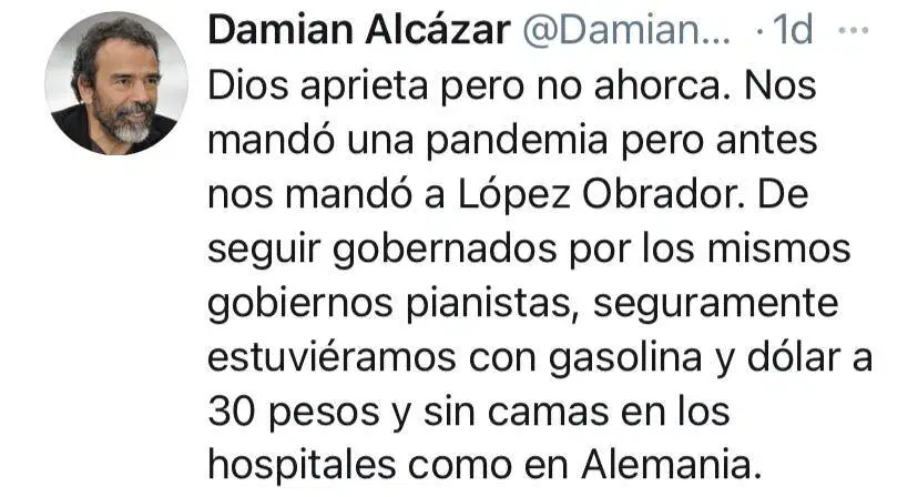 El actor Damian Alcázar escribió en su cuenta de Twitter lo que hubiera sucedido si en 2018 hubiera ganado el PRI o el PAN.